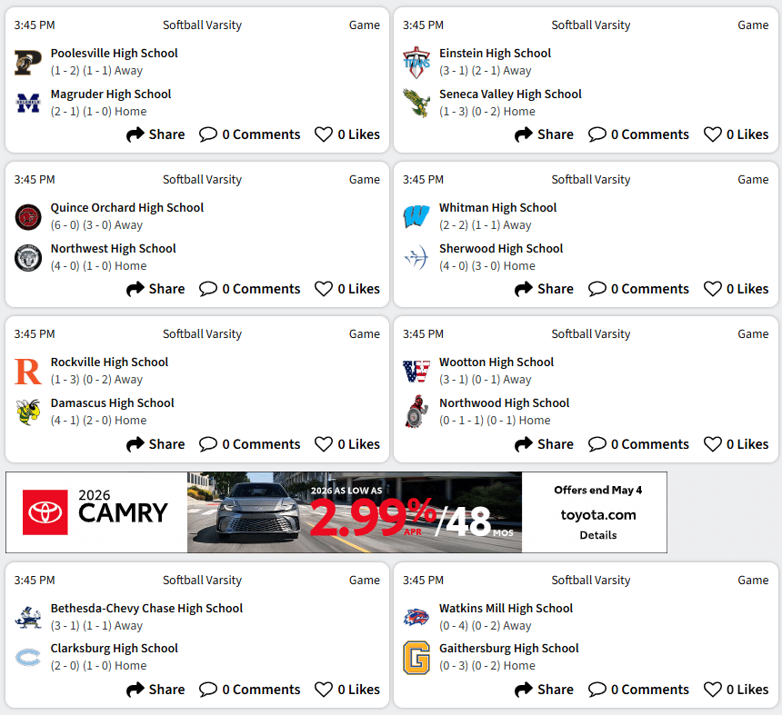 No MCPS softball team played in a game per County Sports Zone over spring break, but regular season action is set to resume on Tuesday! The game of the day appears to be between 6-0 Quince Orchard and 4-0 Northwest, where one of the top three MCPS teams will see a drop on the standings. Also on Tuesday, Watkins Mill will travel to Gaithersburg, where either the Wolverines or the Trojans will pick up their first win on the season! Stay tuned to County Sports Zone this week for the latest updates in MCPS softball.